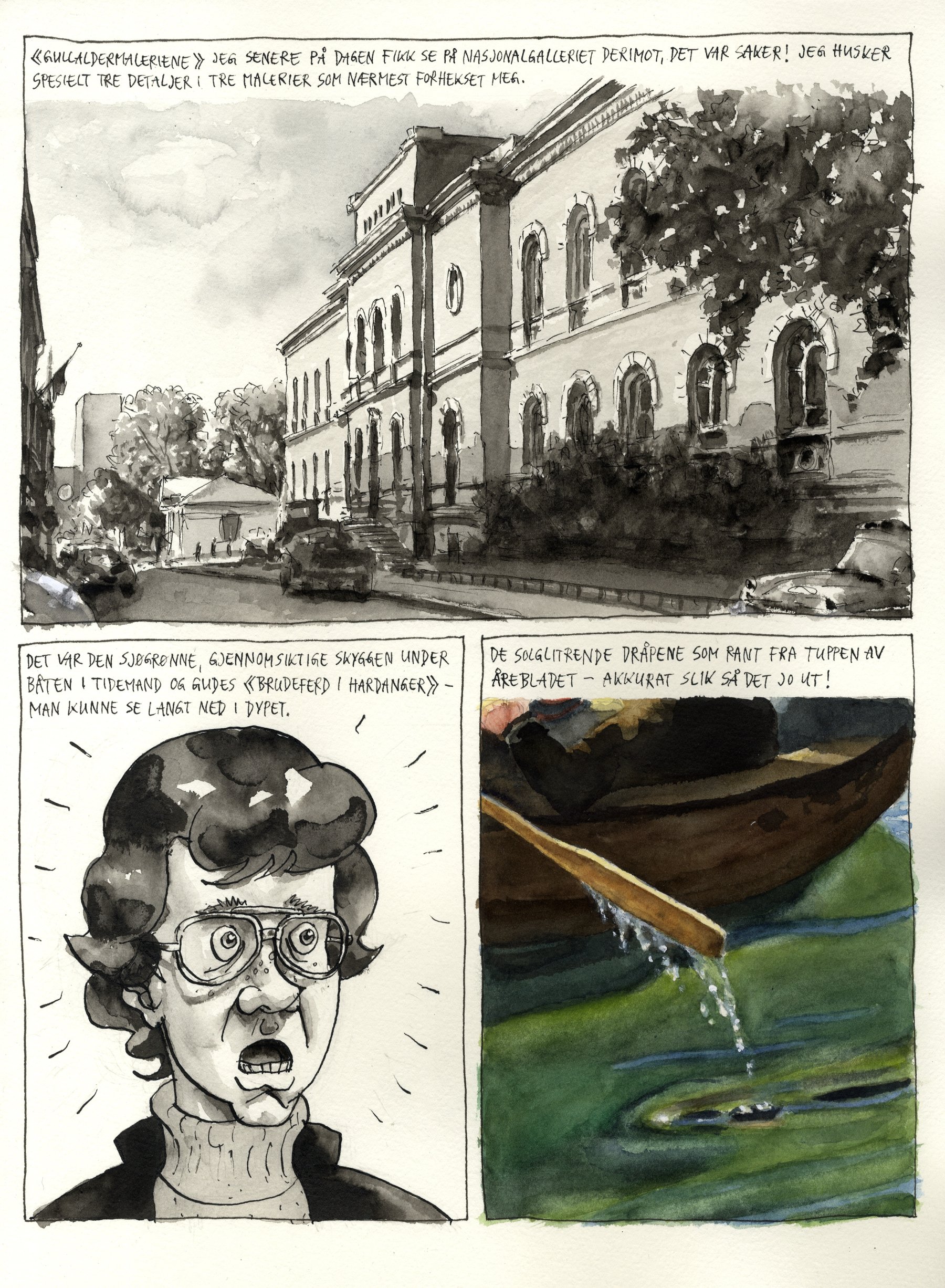 I en scene skildrer han tre detaljer i kunsten som satte preg på ham, opplevd da han besøkte Nasjonalgalleriet i Oslo med sin mor. Det er Tidemand og Gudes vanndråper som drypper fra en åre, Frits Thaulows skispor i snø og Arne Garborgs hånd, malt av Eilif Peterssen. På samme måte som disse detaljene har satt seg hos Kverneland som minner, er det også detaljene i hans egen bok som gjør at denne selvbiografien blir særskilt god: Historien fortelles gjennom en blanding av tegninger, fotografier, faksimiler, maleri, gamle brev, håndskrevne notater og gamle skisser og verker fra livet oppigjennom. Dette gir den dokumentariske formen troverdighet. Det er fornøyelig å se de ulike formene Kverneland eksperimenterer med, fra realistiske skildringer av nabolagssjapper og familiehjem til karikerte selvportretter og gjengivelser av ulike kunstverk som har preget hans egen kunst. Det er slikt samspill, mellom stilartene og stoffet, som i Brillegeit viser at tegneserien er et eminent medium for biografi.