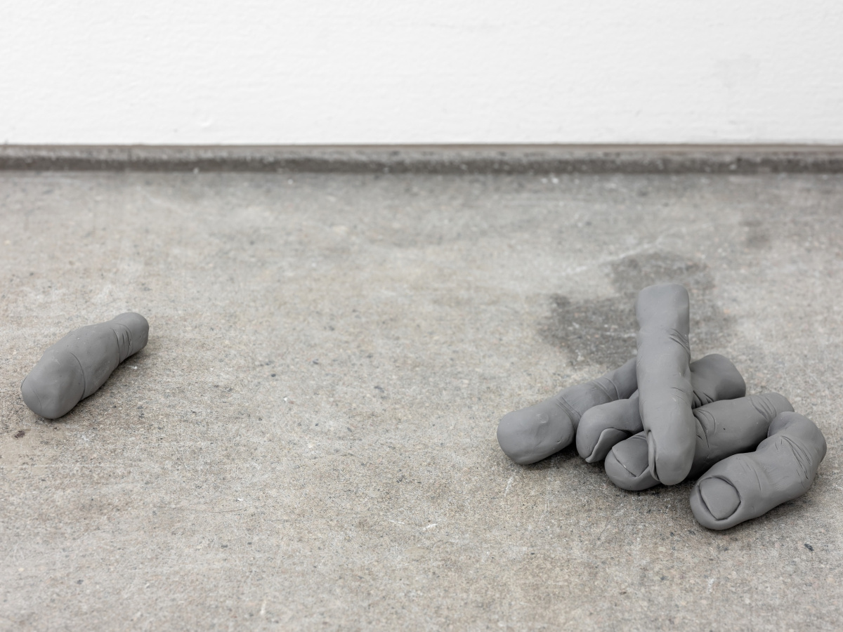 Det førstnevnte bildet viser et tomt, skråstilt lerret sentralt plassert i bildeflaten med en mengde tomme, buklete, gråhvite og gule plastkopper, noen stående, noen liggende, i forgrunnen av bildet. Underlaget lerretet i bildet hviler på, er brunrødt, og veggene er holdt i gråtoner. Det er lett å anta at det har forekommet mye nervøs slurping rundt tømmingen av disse koppene mens motoren har gått på tomgang i atelieret, for å uttrykke det litt miljø-uriktig. I «It’s Not Funny, I Don’t Know Why I’m Laughing» ligger en rekke tommeltotter (er det kanskje ti?) rundt en lang, negleløs langfinger i en krok av gallerirommet. I maleriet «Passive Administration» ligger ark som kunne ha vært brukt til skisser, slengt tilsynelatende uvørent rundt om på et bord med tynne, svarte bein, og i både «Too Slow to Disco» og i «Show-in-Show» figurerer arbeidsredskaper Hiorthøy behersker til fulle: blyanter. De ligger i beredskap både foran lerretet og ved siden av arkene, som påminnelser om at det finnes veier ut av «malerihelvetet». Hiorthøy er for øvrig ikke den første kunstneren som ser ut til å føle seg tynget av den århundrelange maleritradisjonen, diskusjonene rundt maleriets legitimitet og samtidsscenens forventninger om at malere til enhver tid skal stå i en dialog med et nettverk av andre malerier og verden rundt seg. I våre dager, når mediehierarkiet i prinsippet er oppløst, er det imidlertid liten grunn til at det å male skulle oppleves som mer tyngende enn det å produsere kunst av annen art. Likevel er virkeligheten en annen, slik Hiorthøy demonstrerer gjennom den aktuelle utstillingen.